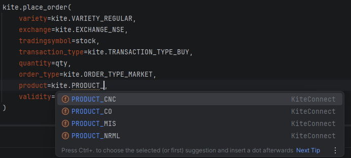 unable to create algorithm to place MTF order using KiteConnect. Kindly guide