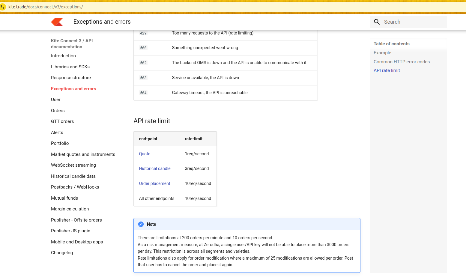 Please update this page : kite doc exceptions page to specify correct limits.