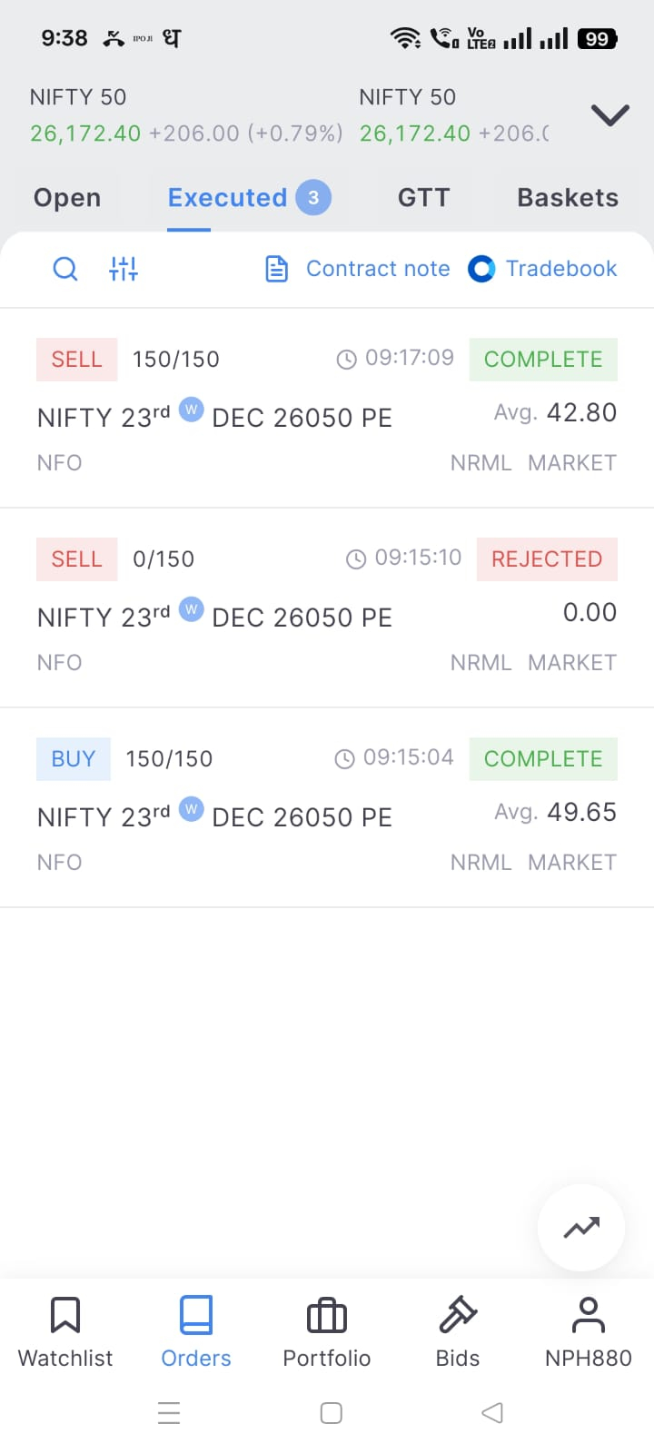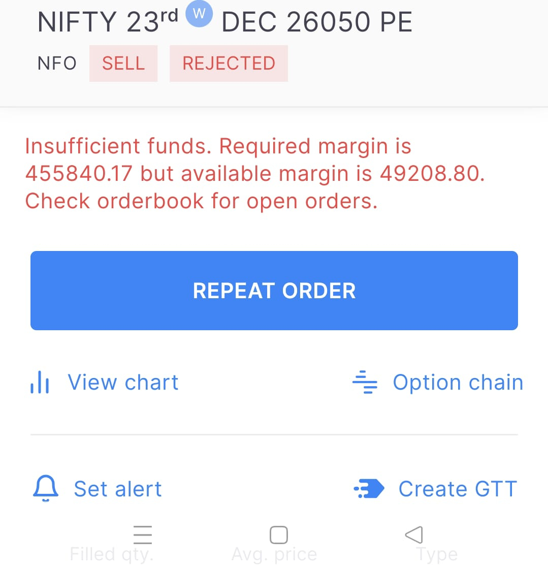Please check below image buy order at price 49.65 26050 PE and sell order failed with insuffient balance. Then I have to exit do exit manually