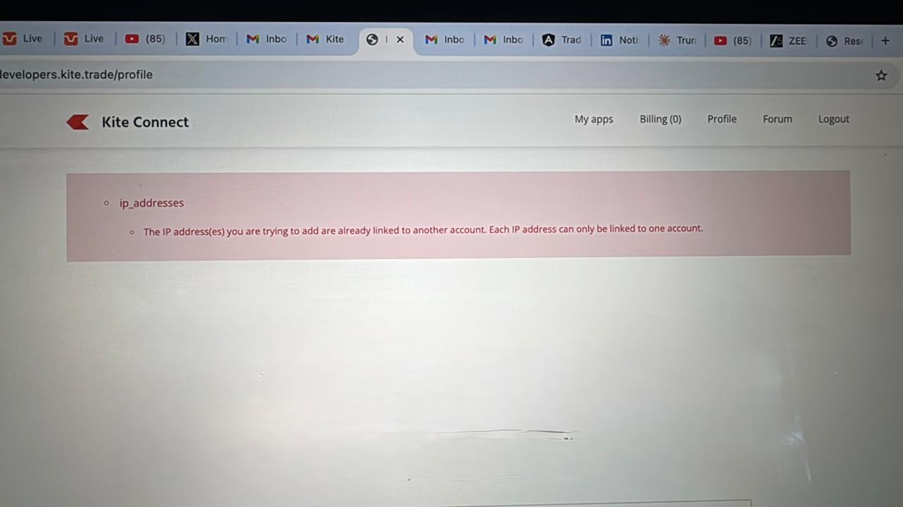 - While attempting to add the same IP across multiple Kite Connect accounts, encountering an error stating: “IP address is already in use.”