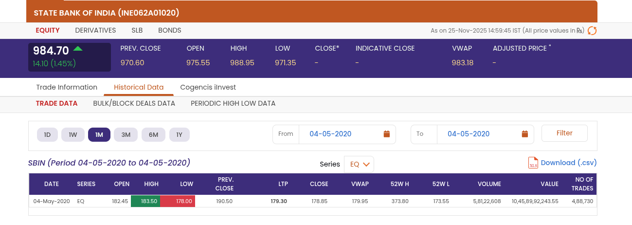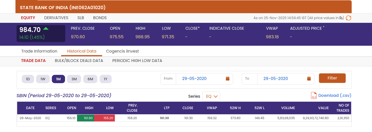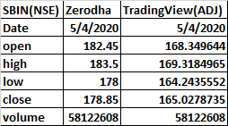 @rakeshr see the SBIN data for 29th May 2020: SBIN(NSE) Zerodha TradingView(ADJ) Date 5/29/2020 5/29/2020 open 156.1 144.0360708 high 161.9 149.3878086 low 155.2 143.2056166 close 161.3 148.8341879 volume 58368035 58368035